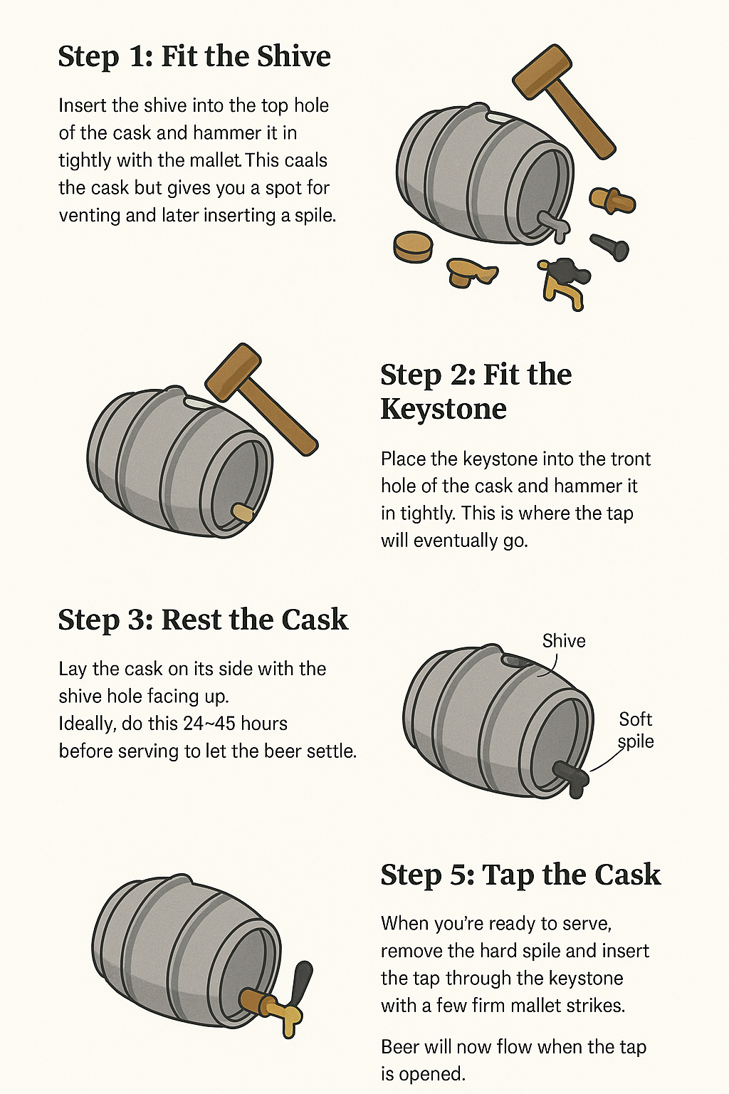 in Cask ale is a beautiful thing — natural carbonation, smooth mouthfeel, and traditional character. Prepping a pin cask the right way makes all the difference, so take your time with venting and tapping. Then enjoy sharing pints with friends, the way it was meant to be.